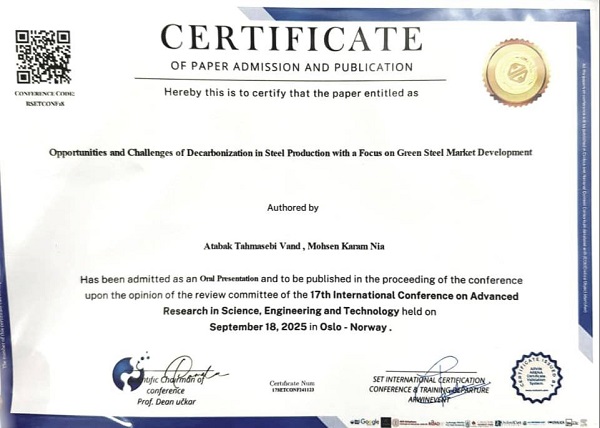 دو تن از کارکنان بخش احیاء شرکت فولاد خوزستان با ارائه مقالهای تحلیلی درباره کربنزدایی و توسعه بازار فولاد سبز، در هفدهمین کنفرانس بین المللی تحقیقات پیشرفته در علوم، مهندسی و فناوری در اسلو نروژ خوش درخشیده و به کسب عنوان مقاله برتر نائل آمدند.