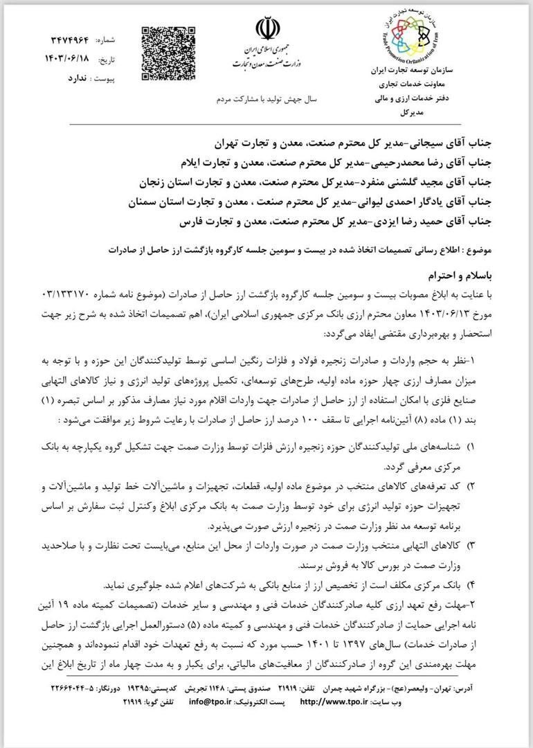 سازمان توسعه تجارت طی نامهای تصمیمات جلسه اخیر کارگروه بازگشت ارز حاصل از صادرات را اعلام کرد که طی آن صادرکنندگان زنجیره فولاد دیگر ملزم به ارائه ارز صادراتی خود در سامانه نیما نیستند.
