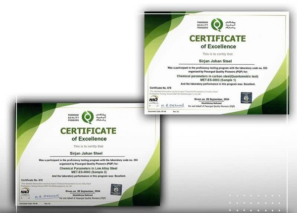 آزمایشگاه شرکت جهان فولاد سیرجان به منظور ارتقای دقت و صحت آزمونهای خود و افزایش رضایت مشتریان موفق شد در آزمون مهارت ۲۶ عنصری در متدهای carbon steel و low alloy steel، رتبه دوم و امتیاز ۹۷.۷ از ۱۰۰ را از شرکت پیشگامان کیفیت پاسارگاد در بین 15 آزمایشگاه معتبر فولادی کسب کند.