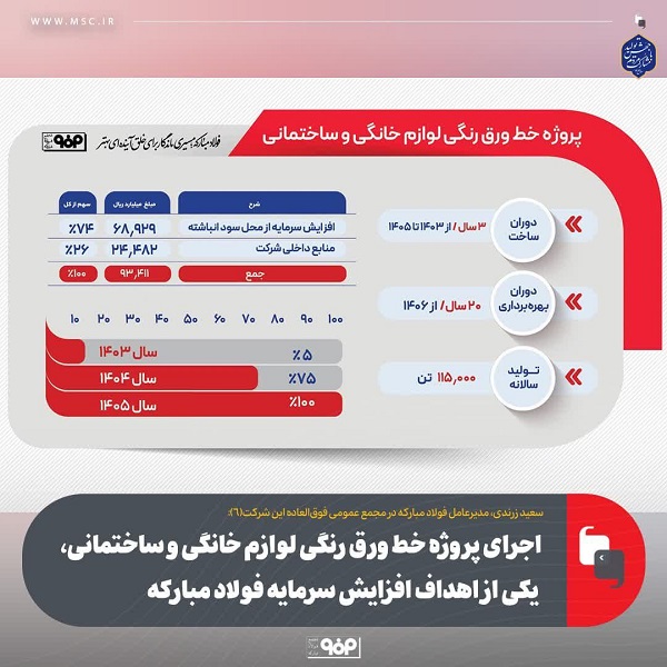 سعید زرندی، مدیرعامل فولاد مبارکه در مجمع عمومی فوقالعاده این شرکت :اجرای پروژه خط ورق رنگی لوازم خانگی و ساختمانی فولاد مبارکه از دیگر اهداف افزایش سرمایه این شرکت است که از سال ۱۴۰۳ آغاز شده و تا سال ۱۴۰۵ و یا اوایل سال ۱۴۰۶ به بهرهبرداری خواهد رسید.