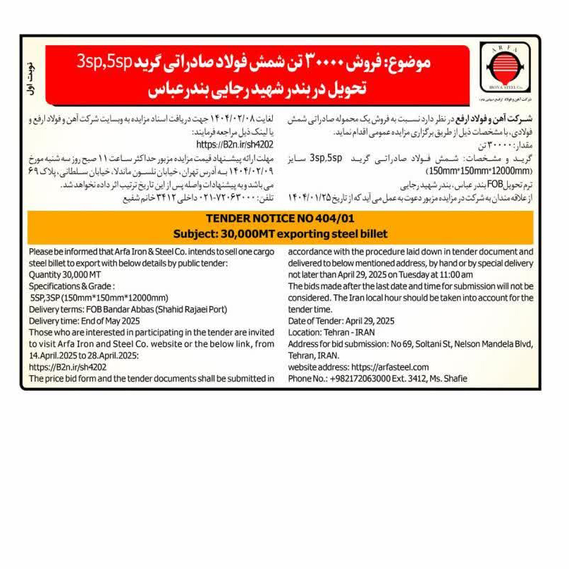 ارفع برای فروش صادراتی یک محموله ۳۰ هزار تنی شمش فولادی ، مزایده برگزار میکند