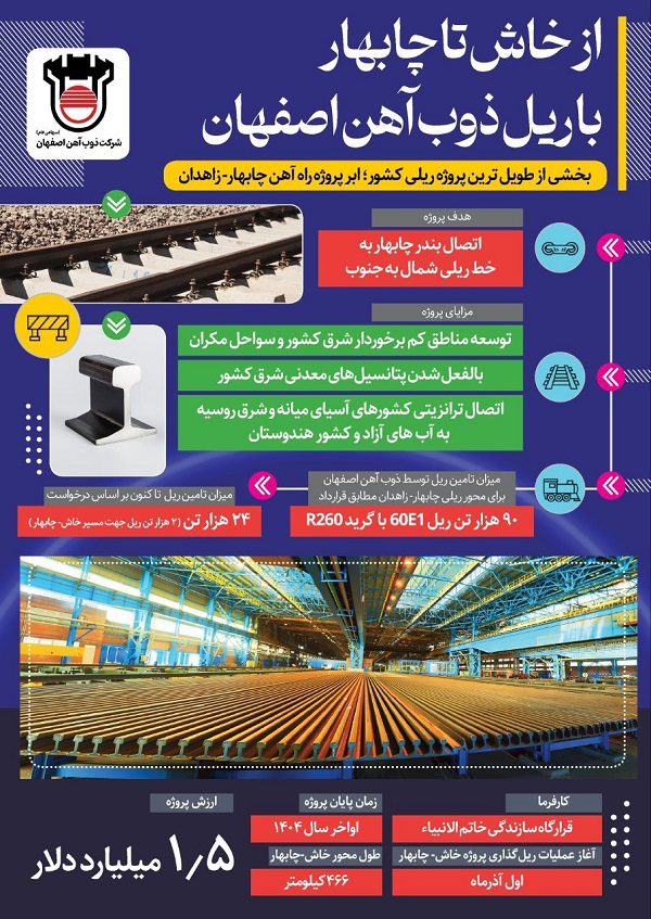 میزان تامین ریل توسط ذوب آهن اصفهان برای محور ریلی چابهار زاهدان مطابق قرارداد ۹۰ هزار تن ریل 60E1 با گرید R260 است.