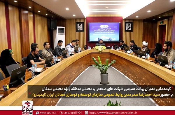 ظهر روز دوشنبه هشتم تیرماه؛ گردهمایی مدیران روابط عمومی شرکت های صنعتی و معدنی منطقه ویژه معدنی سنگان با حضور سید احمدرضا صدر مدیر روابط عمومی سازمان توسعه و نوسازی معادن ایران (ایمیدرو) به میزبانی شرکت اپال پارسیان سنگان برگزار شد.