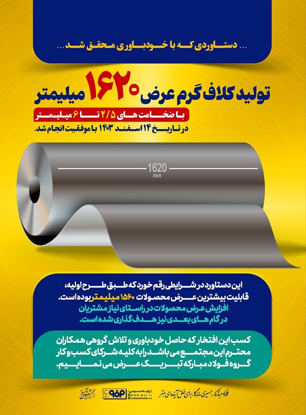 تولید کلاف گرم عرض ۱۶۲۰ میلیمتر با ضخامتهای ۲.۵ تا ۶ میلیمتر در تاریخ ۱۴ اسفند با موفقیت انجام شد.