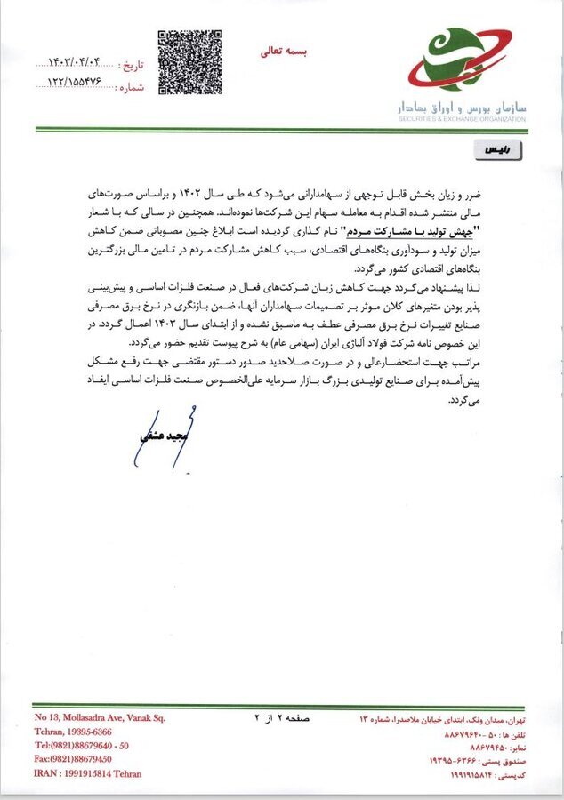 در ادامه این پیگیریها، رییس سازمان بورس و اوراق بهادار در تاریخ ۰۴ تیرماه ۱۴۰۳ و در نامهای به وزیر نیرو به مصوبه بهمنماه وزارت نیرو اشاره و اعلام کرد: بهای برق مشترکان برخی از صنایع با قدرت قراردادی ۲ مگاوات و بیشتر که از اردیبهشتماه سال ۱۴۰۲ صادر شده بود با صدور دستورالعمل جدید باید با نرخهای اصلاح شده مجدداً محاسبه و پرداخت شود. این مصوبه مشمول صنایع بزرگ بازار سرمایه از جمله صنایع فلزات اساسی، استخراج کانیهای فلزی، واحدهای پالایشگاهی و پتروشیمی میشود و براساس مصوبه مذکور نرخ برق مشترکان این صنعت از ۶۰۰ تومان به ۱۲۰۰ تومان به ازای هر کیلو وات ساعت افزایش مییابد، در حالیکه برای سایر ردههای مصرفی ضرایب مساوی یا کمتر از یک درصد اعمال شده است.