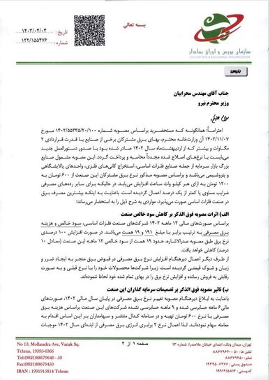 در ادامه این پیگیریها، رییس سازمان بورس و اوراق بهادار در تاریخ ۰۴ تیرماه ۱۴۰۳ و در نامهای به وزیر نیرو به مصوبه بهمنماه وزارت نیرو اشاره و اعلام کرد: بهای برق مشترکان برخی از صنایع با قدرت قراردادی ۲ مگاوات و بیشتر که از اردیبهشتماه سال ۱۴۰۲ صادر شده بود با صدور دستورالعمل جدید باید با نرخهای اصلاح شده مجدداً محاسبه و پرداخت شود. این مصوبه مشمول صنایع بزرگ بازار سرمایه از جمله صنایع فلزات اساسی، استخراج کانیهای فلزی، واحدهای پالایشگاهی و پتروشیمی میشود و براساس مصوبه مذکور نرخ برق مشترکان این صنعت از ۶۰۰ تومان به ۱۲۰۰ تومان به ازای هر کیلو وات ساعت افزایش مییابد، در حالیکه برای سایر ردههای مصرفی ضرایب مساوی یا کمتر از یک درصد اعمال شده است.