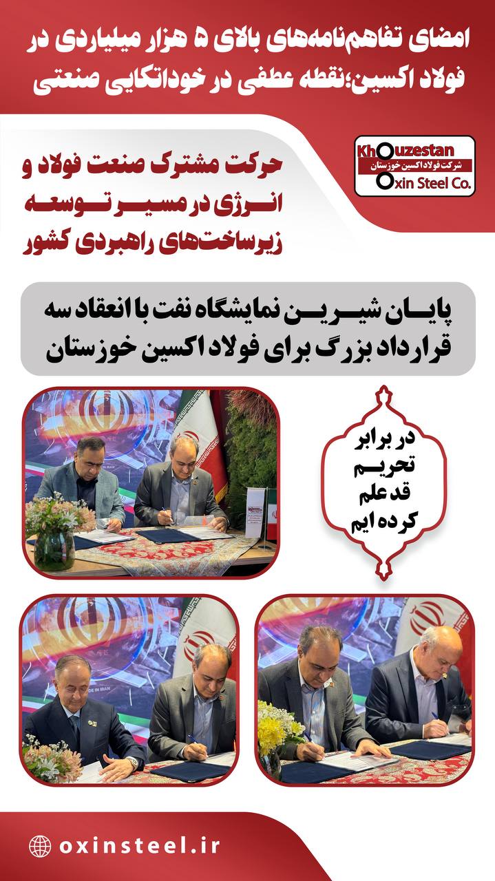 در حاشیه بیست و نهمین نمایشگاه بینالمللی نفت،گاز،پالایش و پتروشیمی،شرکت فولاد اکسین خوزستان موفق به امضای سه تفاهمنامه همکاری به ارزش بیش از ۵ هزار میلیارد تومان (۵ همت) با شرکتهای سهند سازه البرز، پارس کیهان و دانیال پترو شد.