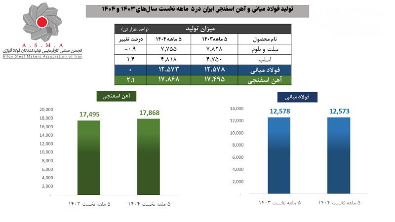 آمار منتشرشده توسط انجمن تولیدکنندگان فولاد آلیاژی نشان میدهد که میزان تولید فولاد میانی ایران در ۵ ماهه نخست سال جاری ۱۲ میلیون و ۵۷۳ هزار تن بوده که تغییر چندانی را نسبت به دوره مشابه سال گذشته نشان نمیدهد.