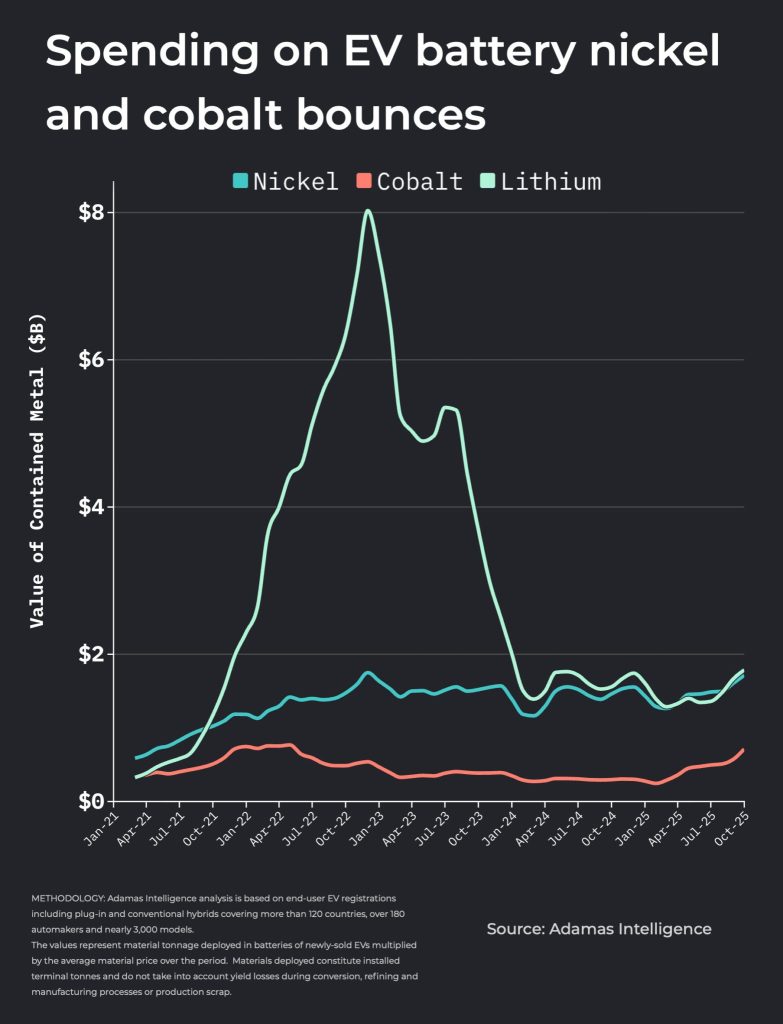 بازگشت کبالت کاملاً ناشی از قیمت است. کنگو (تولیدکننده سهچهارم کبالت جهان) از اکتبر سیستم سهمیهبندی جدیدی اجرا کرده که حجم مجاز صادرات را به ۸۷ هزار تن (حدود نصف سال ۲۰۲۴) محدود میکند.