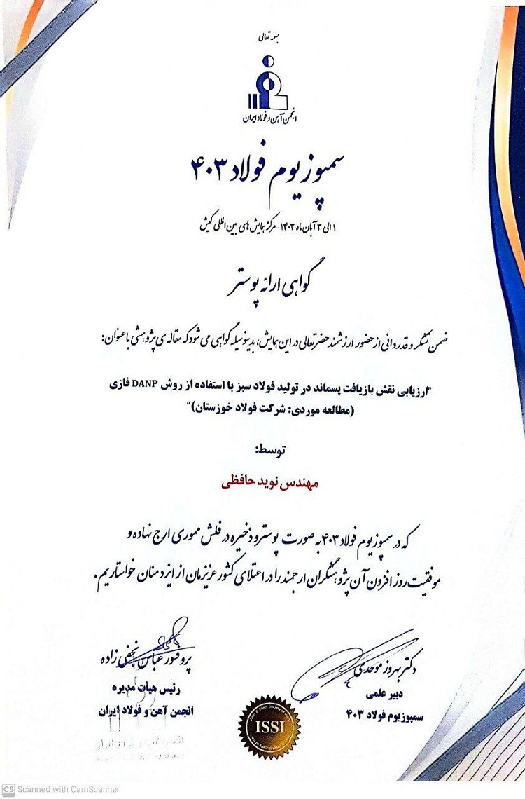 نوید حافظی کارشناس برق و ابزار دقیق شرکت فولاد خوزستان در سمپوزیوم ۱۴۰۳ کیش با ارائه پوستر، گواهینامهی انجمن آهن و فولاد ایران را دریافت نمود.