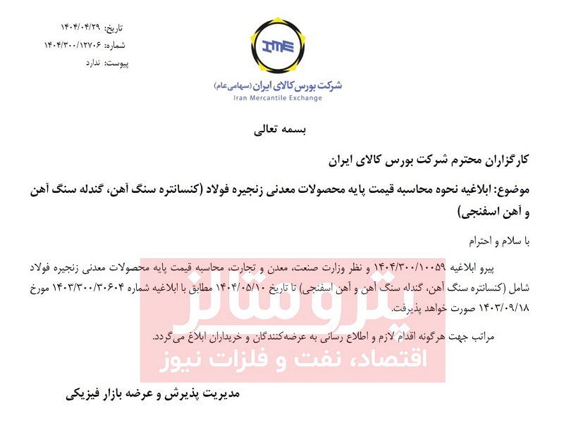 گفتنی است ابتدا در یکم تیرماه سال جاری ابلاغیهای در خصوص نحوه محاسبه قیمت پایه محصولات معدنی زنجیره فولاد (کنسانتره، گندله و آهن اسفنجی) صادر شد که بر اساس آن سقف قیمت پایه کنسانتره، گندله و آهن اسفنجی، برابر با آخرین نرخ ارزش گمرکی آنها بر مبنای نرخ حواله ارز مرکز مبادله ارز و طلا تعیین شده بود.