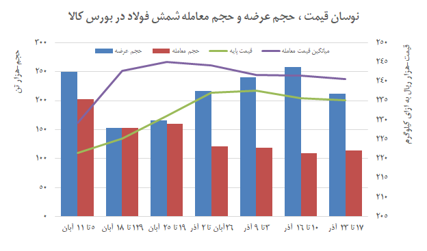 واحدهای فولادی در روز نوزدهم آذر ماه حدود ۲۱۲ هزار تن شمش فولاد را با قیمت پایهای در بازه ۲۲ هزار و ۶۰۰ تومان تا ۲۴ هزار و ۴۱۳ تومان در رینگ صنعتی بورس کالا عرضه کردند؛ برای این محصولات تقاضایی بالغ بر ۱۸۱ هزار تن به ثبت رسید و در نهایت حدود ۱۱۲ هزار تن از این محصول با متوسط قیمتی برابر ۲۴ هزار و ۶۹ تومان مورد دادوستد قرار گرفت.