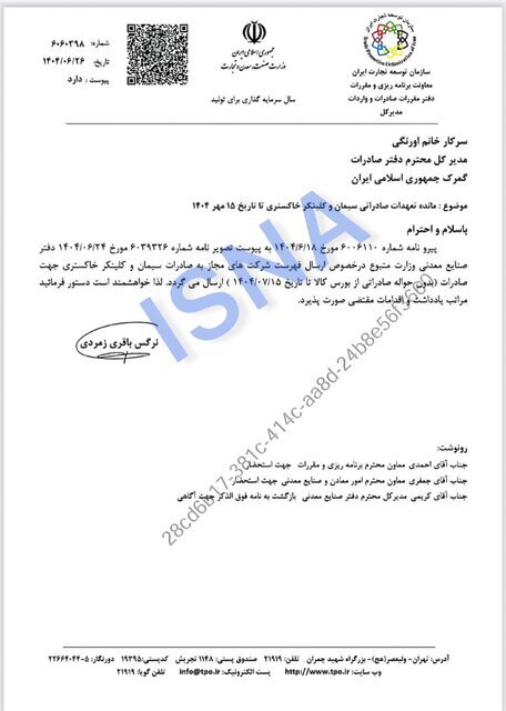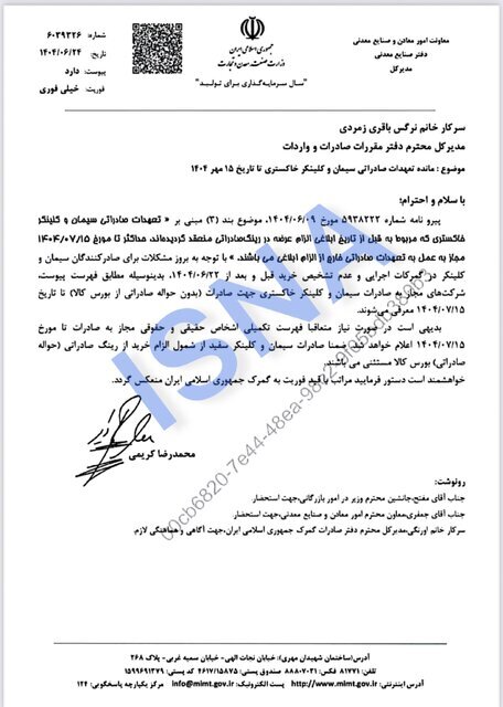 در این نامه همچنین تأکید شد که صادرات سیمان و کلینکر سفید از ابتدا از شمول الزام یادشده مستثنی بوده است.
