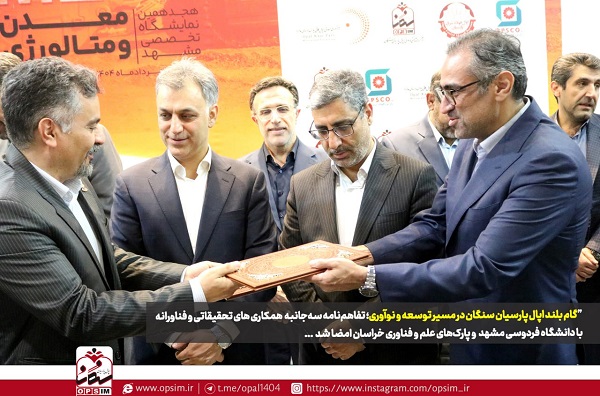 در نخستین روز برگزاری نمایشگاه تخصصی معدن و متالورژی، شرکت اپال پارسیان سنگان با امضای تفاهمنامهای سهجانبه با دانشگاه فردوسی مشهد و پارک علم و فناوری خراسان، گامی مؤثر در راستای توسعه فناوری و تکنولوژی های نوظهور برداشت.