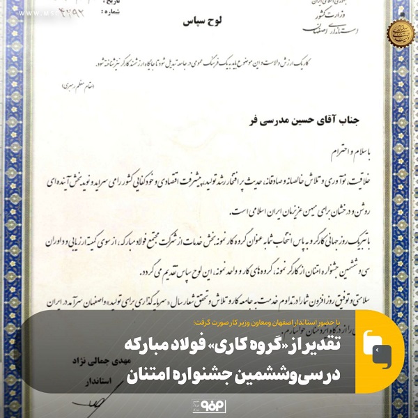 تقدیر از «گروه کاری» فولاد مبارکه در سیوششمین جشنواره امتنان