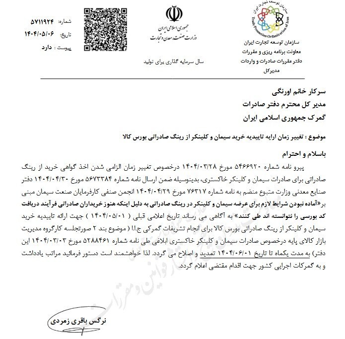 در نتیجه، تاریخ قبلی اعلامشده (۱۴۰۴/۰۵/۰۱) برای الزام ارائه تاییدیه خرید سیمان و کلینکر از رینگ صادراتی بورس کالا، به مدت یکماه و تا تاریخ ۱۴۰۴/۰۶/۰۱ تمدید میشود.