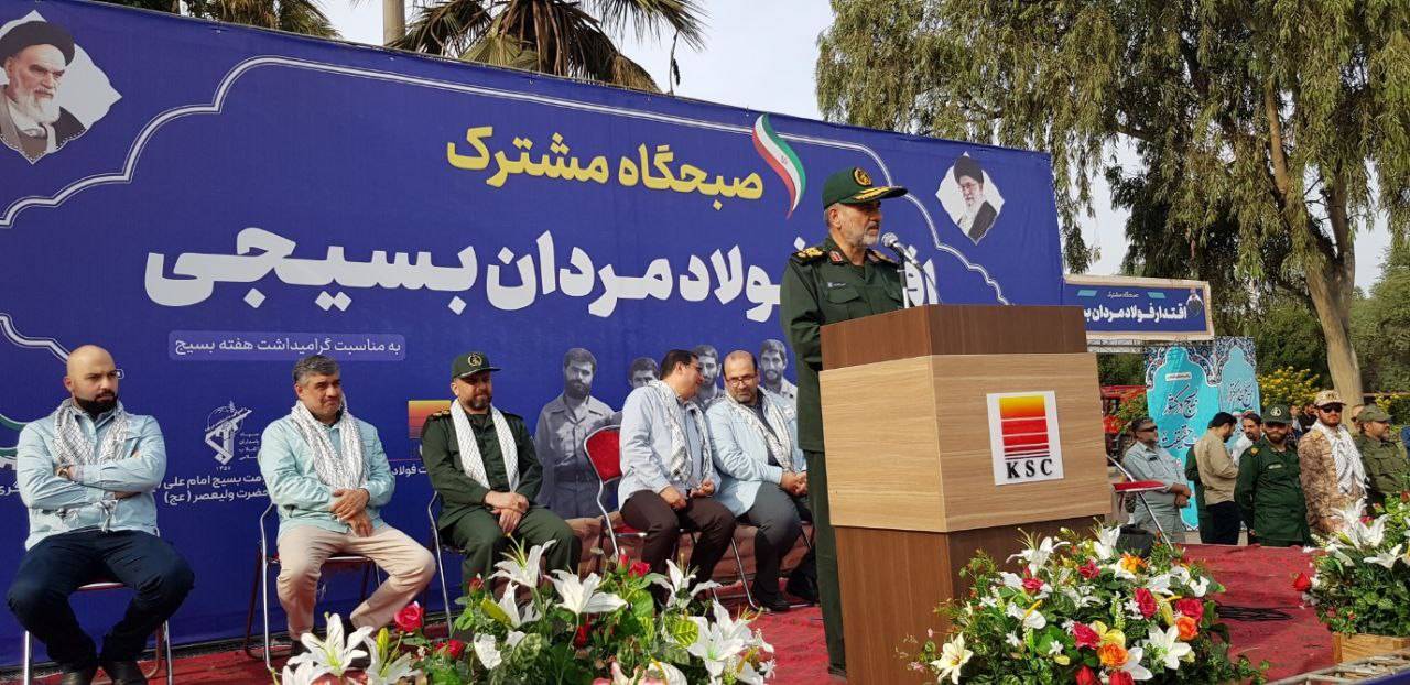 مدیرعامل فولاد خوزستان در پایان خطاب به بسیجیان حاضر در میدان گفت: تولید فکر با هدف حل مسائل از مهمترین راهبردهای بسیج است. هر کجا خودمان را باور کردیم و به شعار ما میتوانیم جامعه عمل پوشاندیم، موفقیت را به دست آوردیم. امروز و در سختترین شرایط تحریم، چرخ صنعت در گردش است. خودباوری و تفکر بسیجی رمز موفقیت فولاد خوزستان است. بسیجی به قدرت ایمان، اعتقاد و اخلاص مسلح است.