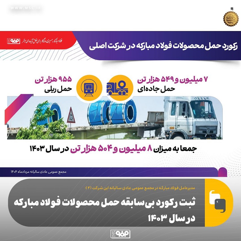 سعید زرندی، مدیرعامل فولاد مبارکه در مجمع عمومی عادی سالیانه این شرکت: شرکت فولاد مبارکه در سال ۱۴۰۳ موفق شد با حمل جادهای ۷ میلیون و ۵۴۹ هزار تن محصول و ۹۵۵ هزار تن محصول از طریق حمل ریلی، به رکورد بیسابقه ۸ میلیون و ۵۰۴ هزار تن حمل محصولات دست پیدا کند.