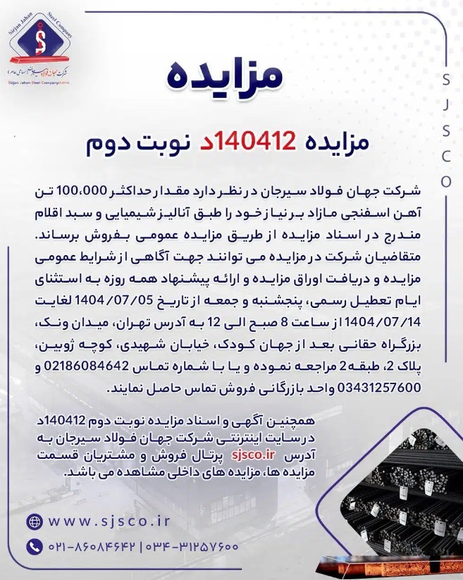همچنین آگهی و اسناد مزایده نوبت دوم 140412د در سایت اینترنتی شرکت جهان فولاد سیرجان به آدرس sjsco.ir پرتال فروش و مشتریان قسمت مزایده ها، مزایده های داخلی مشاهده می باشد.