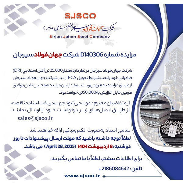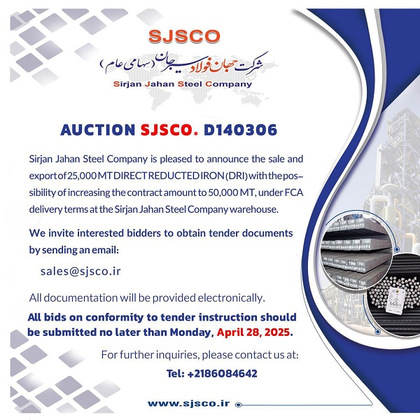 به گزارش پایگاه خبری معدن نامه، شركت جهان فولاد سيرجان در نظر دارد مقدار ٢۵ هزار تن آهن اسفنجي (DRI) صادراتي خود را تحت شرايط تحويل FCA از انبار شركت جهان فولاد سيرجان از طريق مزايده به فروش برساند. مقدار اين مزايده همچنين طبق توافق طرفين قابل افزايش به ۵۰ هزار تن خواهد بود.
