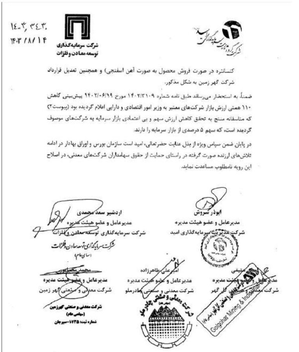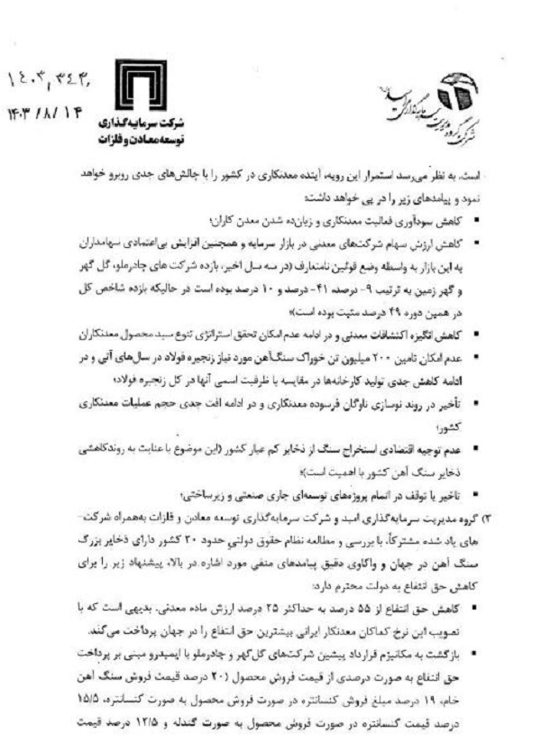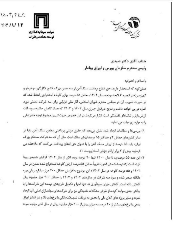 به گزارش پایگاه خبری معدن نامه، در این نامه، ابوذر سروش مدیرعامل سرمایه گذاری امید، اردشیر سعدمحمدی مدیرعامل سرمایه گذاری توسعه معادن و فلزات، ایمان عتیقی مدیرعامل گل گهر، امیرعلی طاهرزاده مدیرعامل چادرملو و محمد محیاپور مدیرعامل گهر زمین به حجت الله صیدی، رئیس سازمان بورس توضیح دادهاند که معادن سنگ آهن در ایران چندین برابر ارقام جهانی ، حقوق دولتی پرداخت می کنند که این موضوع منجر به کاهش سود این شرکتها، مشکل در تامین نقدینگی برای پروژه های ملی و افزایش بی اعتمادی سهامداران به بازار سرمایه شده است.