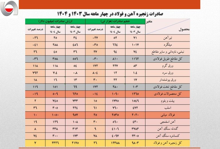 انجمن تولیدکنندگان فولاد ایران آمار صادرات ۴ ماهه سال ۱۴۰۴ زنجیره فولاد کشور را منتشر کرد که بر این اساس حجم صادرات آهن و فولاد کشور، ۱۳ درصد معادل ۴۶۹ هزار تن افزایش داشته است.