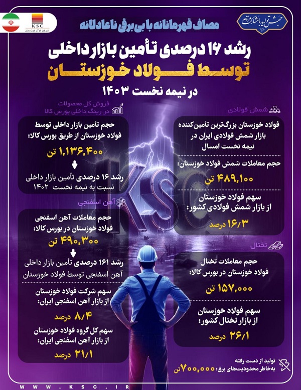 فولاد خوزستان در نیمه نخست سال جاری در حالی که با محدودیتهای بیسابقه و در عین حال ناعادلانه برق روبرو بود و ۷۰۰ هزار تن از تولید خود را به دلیل قطعی برق از دست داد، اما با مدیریت و برنامهریزی صحیح و تلاش فراوان توانست بازار داخلی را به بهترین نحو تامین کند و حجم تامین نیازهای بازار داخلی به محصولات شمش فولادی، تختال و آهن اسفنجی توسط این شرکت در مجموع رشد ۱۶ درصدی را نسبت به مدت مشابه سال قبل تجربه کرد.
