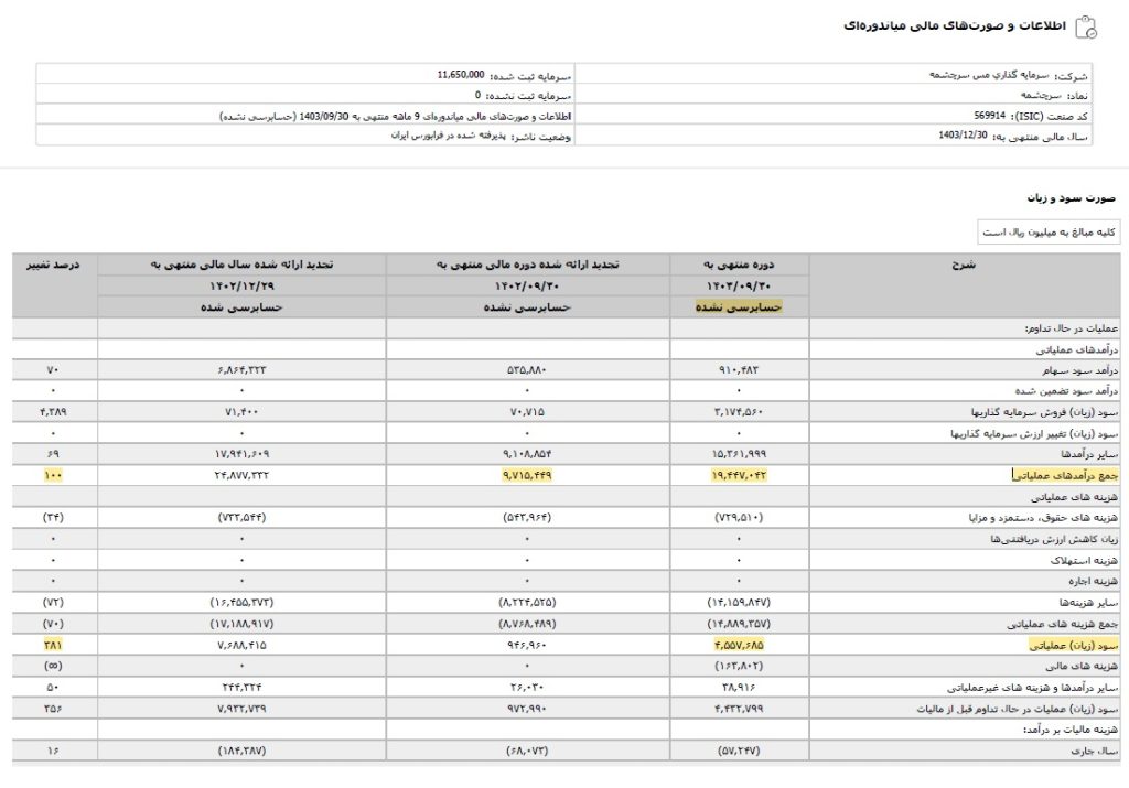 صورتهایی مالی میاندورهای 9 ماهه منتهی به 1403/09/30 (حسابرسی نشده) شرکت سرمایهگذاری مس سرچشمه (نماد”سرچشمه”) منتشر شد.