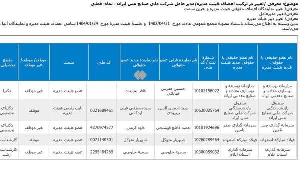به گزارش پایگاه خبری معدن نامه، بر این اساس، نماینده دو شرکت صندوق بازنشستگی شرکت ملی صنایع مس ایران و سرمایهگذاری صدر تامین متعلق به تامین اجتماعی تغییر کرد و نماینده شرکتهای فولاد مبارکه اصفهان و سرمایهگذاری ایلام بدون تغییر ماند.