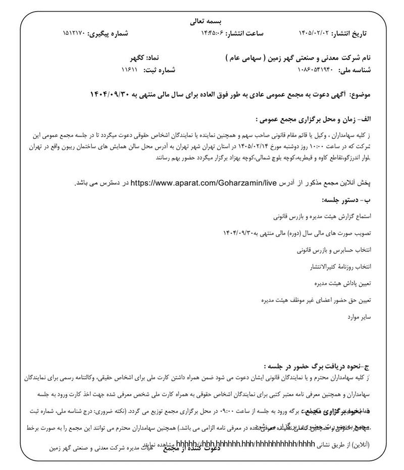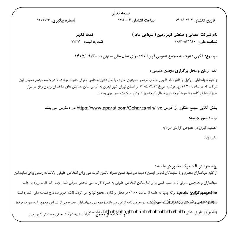شرکت معدنی و صنعتی گهرزمین سهامداران خود را برای شرکت در مجمع عمومی عادی به طور فوق العاده و عمومی فوق العاده فراخواند.