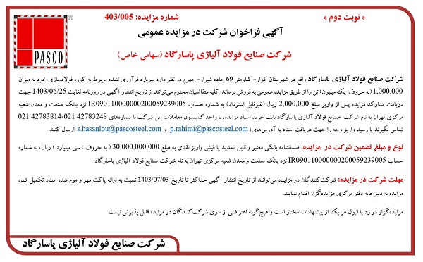 شرکت صنایع فولاد آلیاژی پاسارگاد بهمنظور فروش سرباره مزایده برگزار میکند