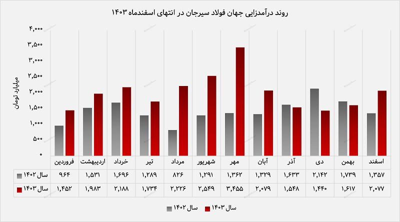 شرکت جهان فولاد سیرجان در اسفندماه ۱۴۰۳ با ثبت درآمد عملیاتی ۲،۰۷۷ میلیارد تومانی، رشد خیرهکننده ۵۳ درصدی نسبت به سال گذشته را تجربه کرد.