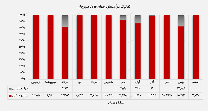 شرکت جهان فولاد سیرجان در اسفندماه ۱۴۰۳ از فروش محصولات در بازار داخلی کسب درآمد کرد. اما از در بخش تجمیعی شاهد حضور شرکت در هر ۲ بازار داخلی و صادراتی هستیم. میزان درآمدزایی شرکت در بازار داخل کشور شامل ۹۶ درصد از درآمد تجمیعی طی ۱۲ ماه منتهی به اسفندماه ۱۴۰۳ هست. مابقی درآمد شرکت مربوط به بازار صادراتی است که سهم ۴ درصدی را در اختیار دارد.