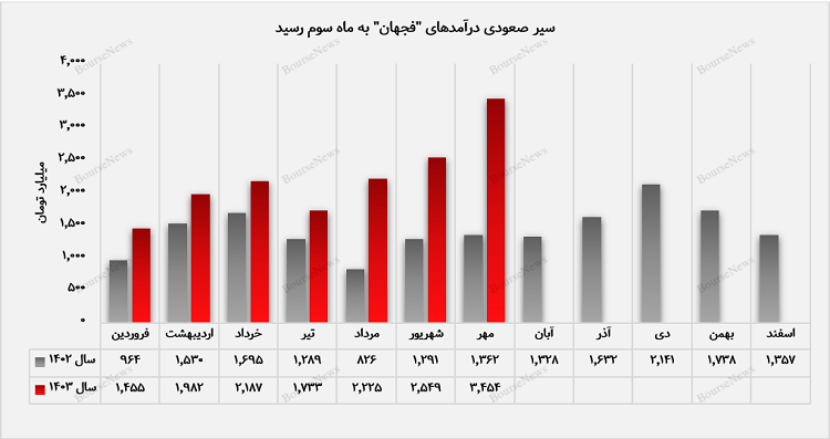 درآمد ماهانه “فجهان” در مهرماه سال جاری ۳۶ درصد افزایش را در مقایسه با ماه گذشته تجربه کرد و توانست روند صعودی خود را به سومین ماه برساند. این شرکت در تمام ماههای گذشته قدرتنمایی درآمدزایی خود را به رخ کشیده است و در مقایسه با ماههای سال گذشته با افزایش همراه بوده است. اکنون در مهرماه نسبت به دوره مشابه سال گذشته افزایش ۱۵۴ درصدی را در کارنامه مالی خود به ثبت رسانده است.