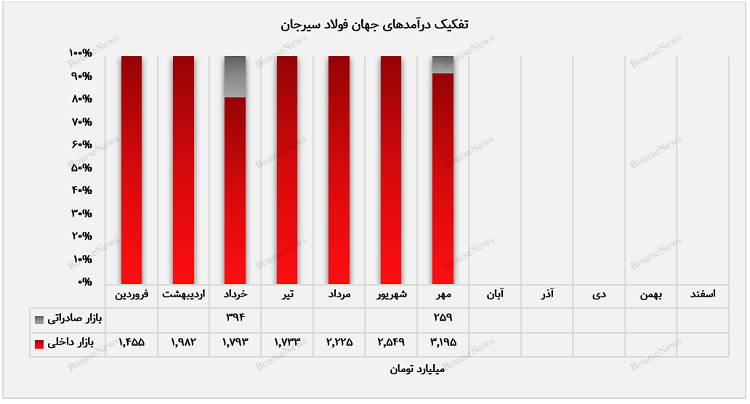 شرکت جهان فولاد سیرجان همانطور که گفته شد در بازارهای داخلی و صادراتی مشغول به فعالیت است. بازار داخل کشور در مهرماه سال جاری دربرگیرندهی ۹۲ درصد از درآمدهای این دوره بود و مابقی آن نیز به بازار صادراتی متعلق بود. میزان درآمدی که از فروش محصولات در بازار صادراتی شناسایی شد برابر با مبلغ ۲۵۹ میلیارد تومان بود. تنها محصولی که فجهان در این بازار از فروش آن کسب درآمد کرد مربوط به آهن اسفنجی بود.