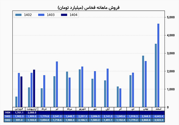 شرکت «فخاس» در دوره مالی یک ماهه منتهی به اردیبهشت مبلغ ۲۰۸۸ میلیارد تومان از فروش محصولات بدست آورده است که جمع درآمد شرکت از ابتدای سال مالی تا تاریخ ۱۴۰۴/۰۲/۳۱ مبلغ ۳۷۸۹ میلیارد تومان بوده است.