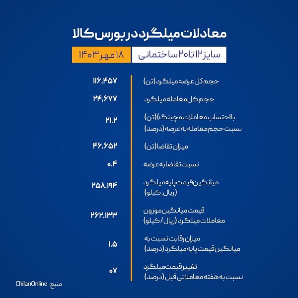 چهارشنبه ۱۸ مهر ماه ۱۴۰۳، ۱۱۶ هزار تن میلگرد پُرمصرف ساختمانی (سایز ۱۲ تا ۲۰) در بورس کالا عرضه شد که با احتساب معاملات مچینگ، ۲۴ هزار تن معادل ۲۱.۲ درصد از این عرضهها مورد معامله قرار گرفت.