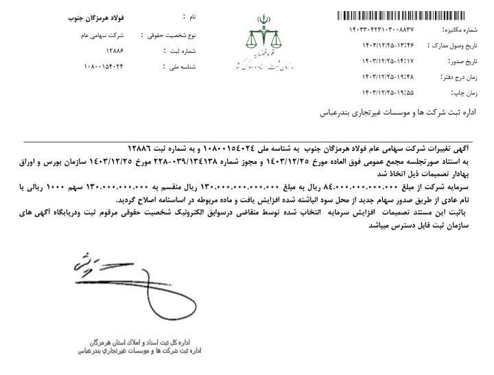 با ثبت رسمی این افزایش سرمایه، ماده مربوط به سرمایه شرکت در اساسنامه فولاد هرمزگان اصلاح شد و اطلاعات مربوط به آن در پایگاه آگهیهای رسمی سازمان ثبت اسناد و املاک کشور قابل دسترس است.