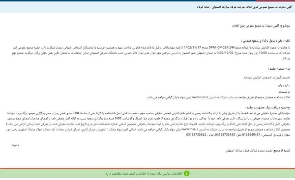 شرکت فولاد مبارکه اصفهان (فولاد) در نظر دارد مجمع عمومی فوقالعاده شرکت را در روز چهارشنبه ۲ اسفند برگزار کند.