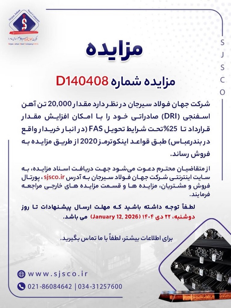 شرکت جهان فولاد سیرجان در نظر دارد مقدار 20,000 تن آهن اسفنجی (DRI) صادراتی خود را با امکان افزایش مقدار قرارداد تا 25 درصد تحت شرایط تحویل FAS (در انبار خریدار واقع در بندرعباس) طبق قواعد اینکوترمز 2020 از طریق مزایده به فروش رساند.