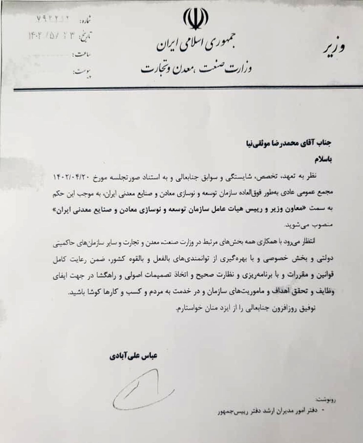 در حکم عباس علی آبادی وزیر صنعت، معدن و تجارت آمده است: “نظر به تعهد، تخصص، شایستگی و سوابق جنابعالی و به استناد صورتجلسه مجمع عمومی عادی به طور فوق العاده سازمان توسعه و نوسازی معادن و صنایع معدنی ایران به موجب این حکم سمت “معاون وزیر و رییس هیات عامل سازمان توسعه و نوسازی معادن و صنایع معدنی ایران منصوب می شوید.”