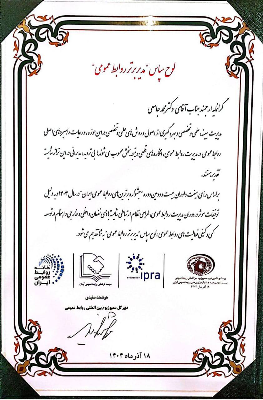 در سمپوزیوم و جشنواره یادشده که روز ۱۸ آذرماه ۱۴۰۴ با عنوان نقش و کارکردهای روابط عمومی راهبردی در بحرانهای جنگی در مرکز همایشهای کتابخانه ملی ایران واقع در تهران برگزار شد، لوح و تندیس مدیر روابط عمومی برتر به محمد جامعی مدیر روابط عمومی اعطا شد که حسن شهیتی از کارشناسان این واحد به نیابت بهروی سن رفته و لوح و نشان را دریافت نمود.