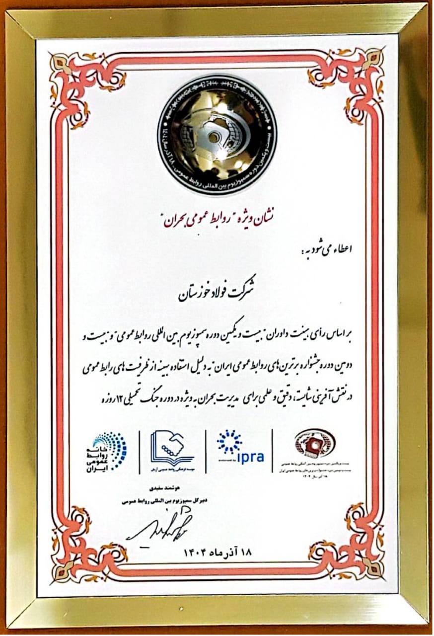 نشان ویژه روابط عمومی بحران به ویژه در جنگ تحمیلی ۱۲ روزه به روابط عمومی شرکت فولاد خوزستان اعطا شد