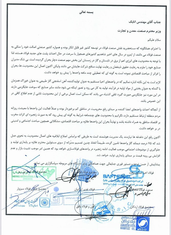 بنا به نامهای که تصویر آن در فضای مجازی منتشر شده، هشت شرکت تولیدکننده آهن اسفنجی خطاب به وزیر صمت با اعلام اینکه گاز مصرفی این صنایع، نقش خوراک دارد و نمیتوان آن را با سوخت دیگری جایگزین کرد، تبعات محدودیتهای گاز برای واحدهای احیاء مستقیم را تشریح کردند.