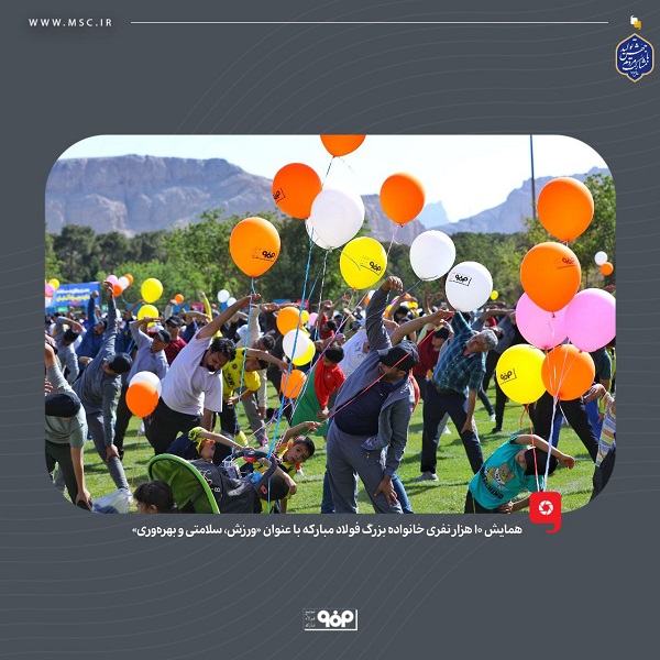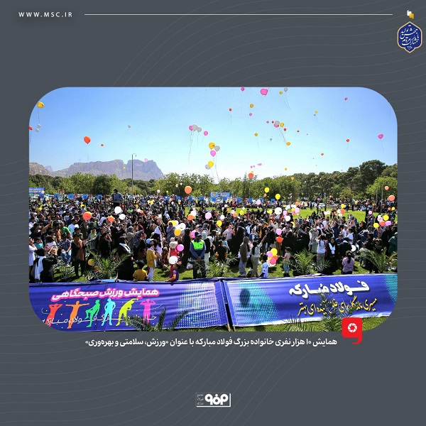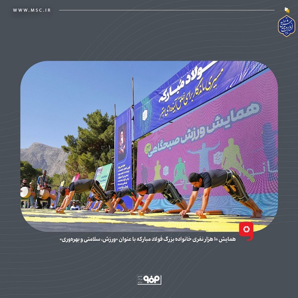 همایش بزرگ ورزش صبحگاهی خانواده بزرگ شرکت فولاد مبارکه اصفهان با عنوان «ورزش، سلامتی، بهرهوری» صبح روز جمعه ۱۱ خرداد در مجموعه اردوگاه شهید بهشتی شهر ابریشم اصفهان با حضور ۱۰۴۰۰ نفر از کارکنان فولاد مبارکه و خانواده هایشان برگزار شد.