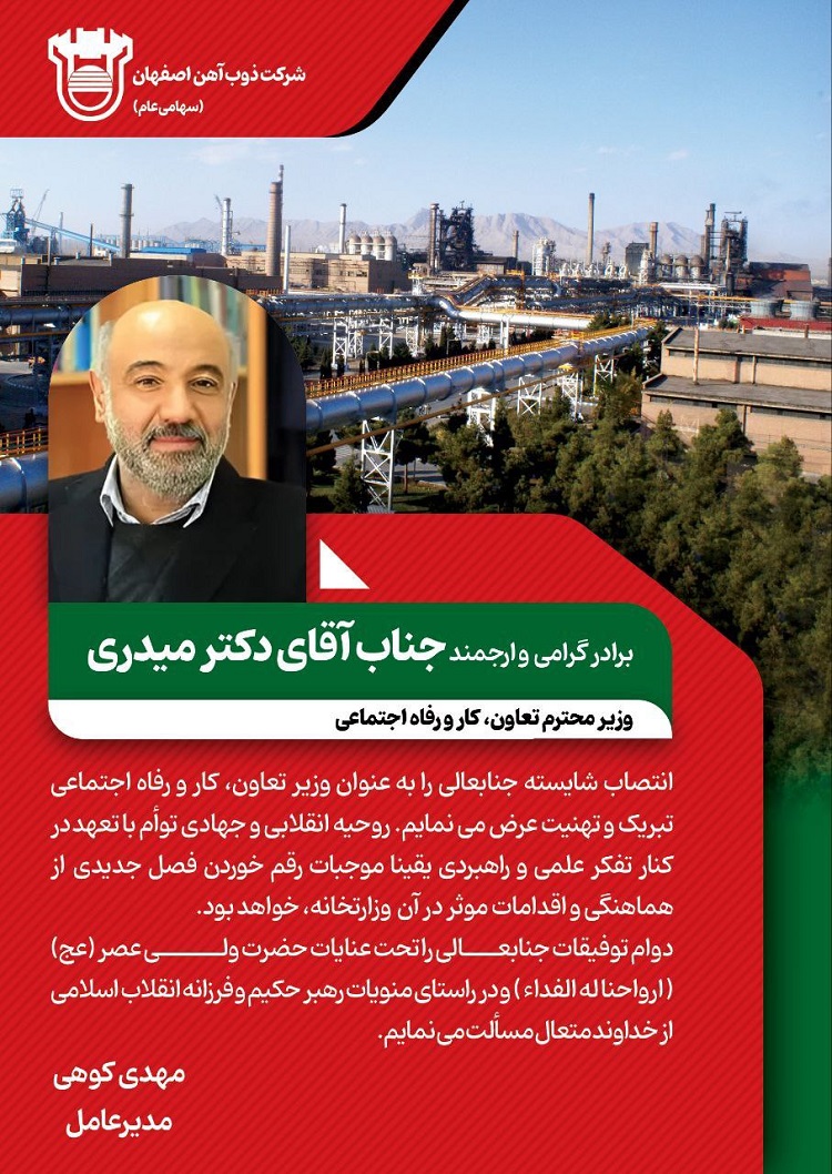 پیام تبریک مدیرعامل ذوب آهن اصفهان به مناسبت انتصاب جناب آقای دکتر میدری ،وزیر محترم تعاون، کار و رفاه اجتماعی