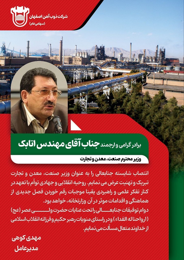 پیام تبریک مدیرعامل ذوب آهن اصفهان به مناسبت انتصاب جناب آقای مهندس اتابک، وزیر محترم صنعت، معدن و تجارت