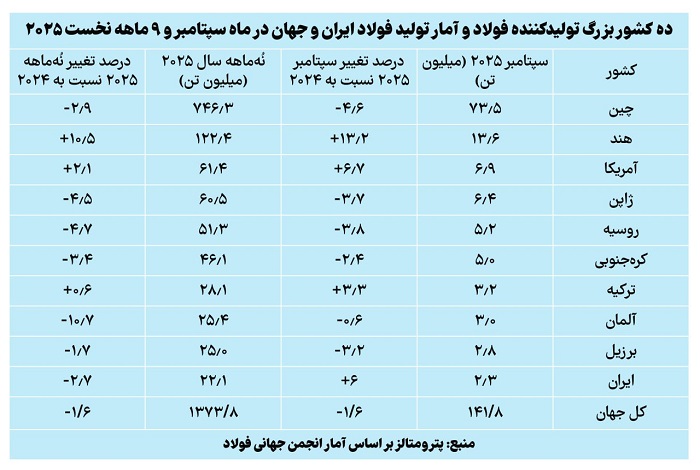 در میان تولیدکنندگان بزرگ، چین با وجود کاهش ۴٫۶ درصدی تولید در ماه سپتامبر و ۲٫۹ درصدی در دوره نُهماهه، همچنان با ۷۴۶٫۳ میلیون تن در صدر جدول قرار دارد. پس از آن، هند با تولید ۱۲۲٫۴ میلیون تن در نُهماهه سال جاری و رشد قابلتوجه ۱۰٫۵ درصدی، جایگاه دوم جهانی خود را تثبیت کرده و بهعنوان تنها اقتصاد بزرگ با روند صعودی مداوم در بخش فولاد شناخته میشود.