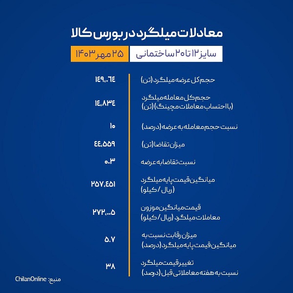 بیشترین قیمت معاملاتی در این بازار در حالی به عرضه اعتباری فولاد خراسان قیمت ۲۸۲۰۰ تومان تعلق گرفت که میانگین موزون میلگرد مرسوم بازار (۱۲ تا ۲۰) در معاملات روز چهارشنبه به ۲۷۲۰۰ تومان در هر کیلو به ثبت رسید.