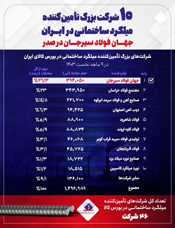 بررسی آمار معاملات میلگرد ساختمانی در بورس کالای ایران طی ۹ ماهه نخست سال ۱۴۰۳ نشان میدهد که شرکت جهان فولاد سیرجان با معامله ۳۹۴,۰۵۰ تن میلگرد و سهم چشمگیر ۲۶.۳ درصدی از کل معاملات میلگرد ساختمانی، با اختلاف قابل توجه نسبت به رقبا، در صدر تأمینکنندگان این محصول قرار گرفته است.